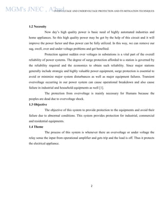 The document discusses overvoltage and undervoltage protection for electrical systems, detailing their causes, effects, and mitigation techniques. It explains the importance of maintaining high-quality power to protect sensitive equipment and outlines a circuit designed to detect and respond to voltage fluctuations, thereby preventing damage. The paper emphasizes the need for effective voltage monitoring and relay systems in both industrial and residential settings.