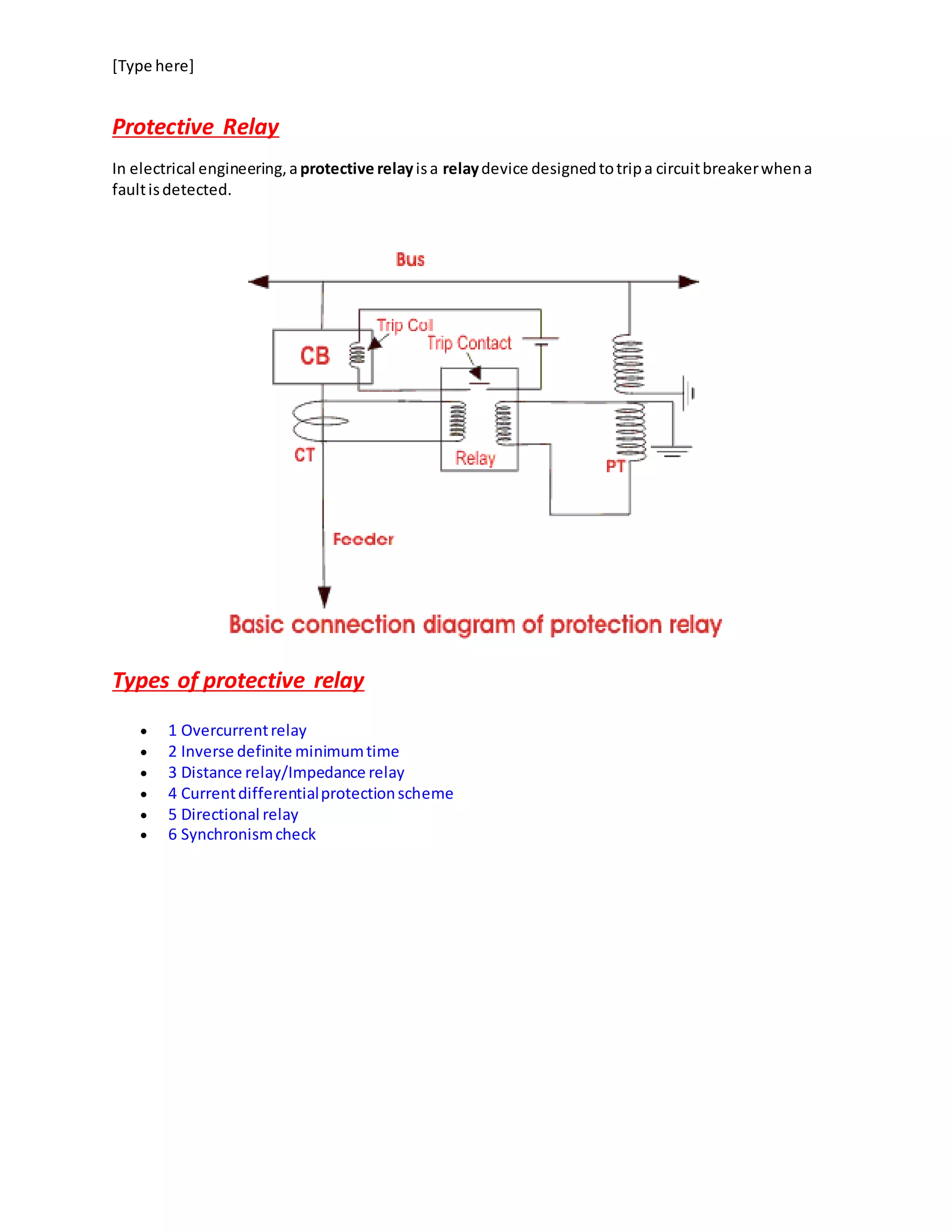 This document discusses several types of protective relays used in electrical engineering. It describes overcurrent relays, distance/impedance relays, differential relays, directional overcurrent relays, and synchronism check relays. The key aspects covered include how each type of relay works, what electrical quantities they measure, and their applications in protecting electrical equipment from faults.