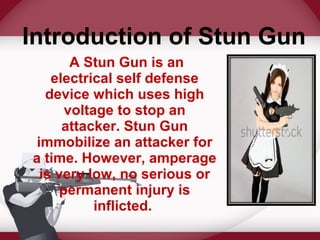 The document outlines various types of stun guns available in Madurai, highlighting their effectiveness as electrical self-defense devices that immobilize attackers without causing permanent harm. It emphasizes the rising safety concerns for women due to increasing crime rates and promotes the use of stun guns for personal protection. Additionally, it mentions special offers from the latest spy store, such as free demos and discounts for online purchases.