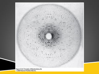This document discusses protein structure and function. It defines different levels of protein structure from primary to quaternary, and describes common secondary structures like alpha helices and beta sheets. Alpha helices are right-handed coils stabilized by hydrogen bonds between amino acids four positions apart in the sequence. Beta sheets consist of beta strands connected laterally by hydrogen bonds to form flat sheets, which can be arranged in parallel or anti-parallel configurations. Tertiary structure refers to the overall three-dimensional shape of a protein formed by the folding and interaction of secondary structures.