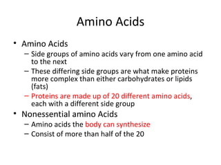Proteins are made up of amino acids and perform many essential functions in the body. They are needed for growth, maintenance, as enzymes, hormones, and for fluid balance regulation. There are 20 amino acids, 9 of which the body cannot synthesize and must obtain through diet. High quality proteins come from animal sources like meat and dairy, while plant proteins may be limiting in some amino acids. Recommended daily protein intake is 0.8 grams per kilogram of body weight.
