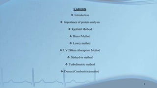 The Kjeldahl method involves digesting proteins with sulfuric acid to convert nitrogen to ammonium sulfate, then distilling and titrating to determine protein content. The Biuret method uses a color reaction between copper ions and peptide bonds to quantify proteins. The Lowry method combines the Biuret reaction with reduction of Folin-Ciocalteu reagent by amino acids for high sensitivity. Other methods discussed include measuring UV absorption at 280nm and color reactions with ninhydrin or in turbidimetric assays. The document compares the principles, procedures, applications, and advantages/disadvantages of each approach.