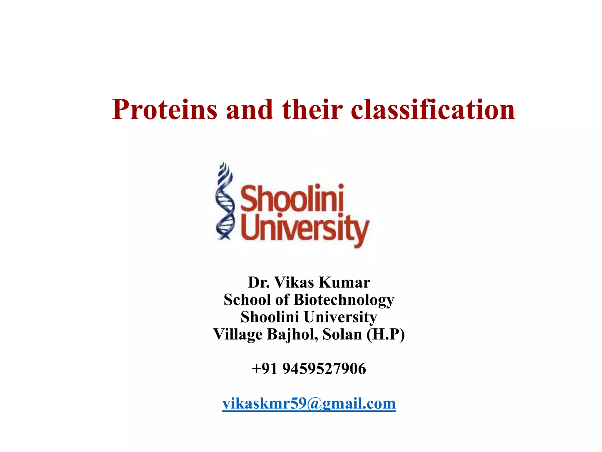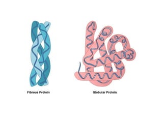 This document discusses protein classification and structure. It begins by defining proteins and noting that there are 22 standard amino acids that make up all proteins. Proteins are then classified based on their shape into globular, fibrous, and intermediate proteins. Globular proteins are more compact and spherical while fibrous proteins are long strands used for structure. The document also discusses protein structure at the primary, secondary, tertiary, and quaternary levels. Primary structure is the amino acid sequence, secondary involves coiling into alpha helices or beta sheets, tertiary is the protein's 3D shape from folding, and quaternary involves interactions of multiple protein subunits. Common structural proteins like collagen and keratin are also mentioned.