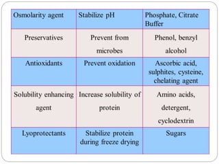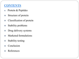 This document discusses protein and peptide drug delivery systems. It begins by defining proteins and peptides, and describing their structures. It then discusses various challenges in delivering protein and peptide drugs, such as stability issues like denaturation, aggregation, oxidation, and proteolysis. It also categorizes different drug delivery routes like parenteral, pulmonary, transdermal, and oral. Finally, it provides examples of marketed protein and peptide drug formulations and discusses strategies to improve stability and delivery of these drugs.