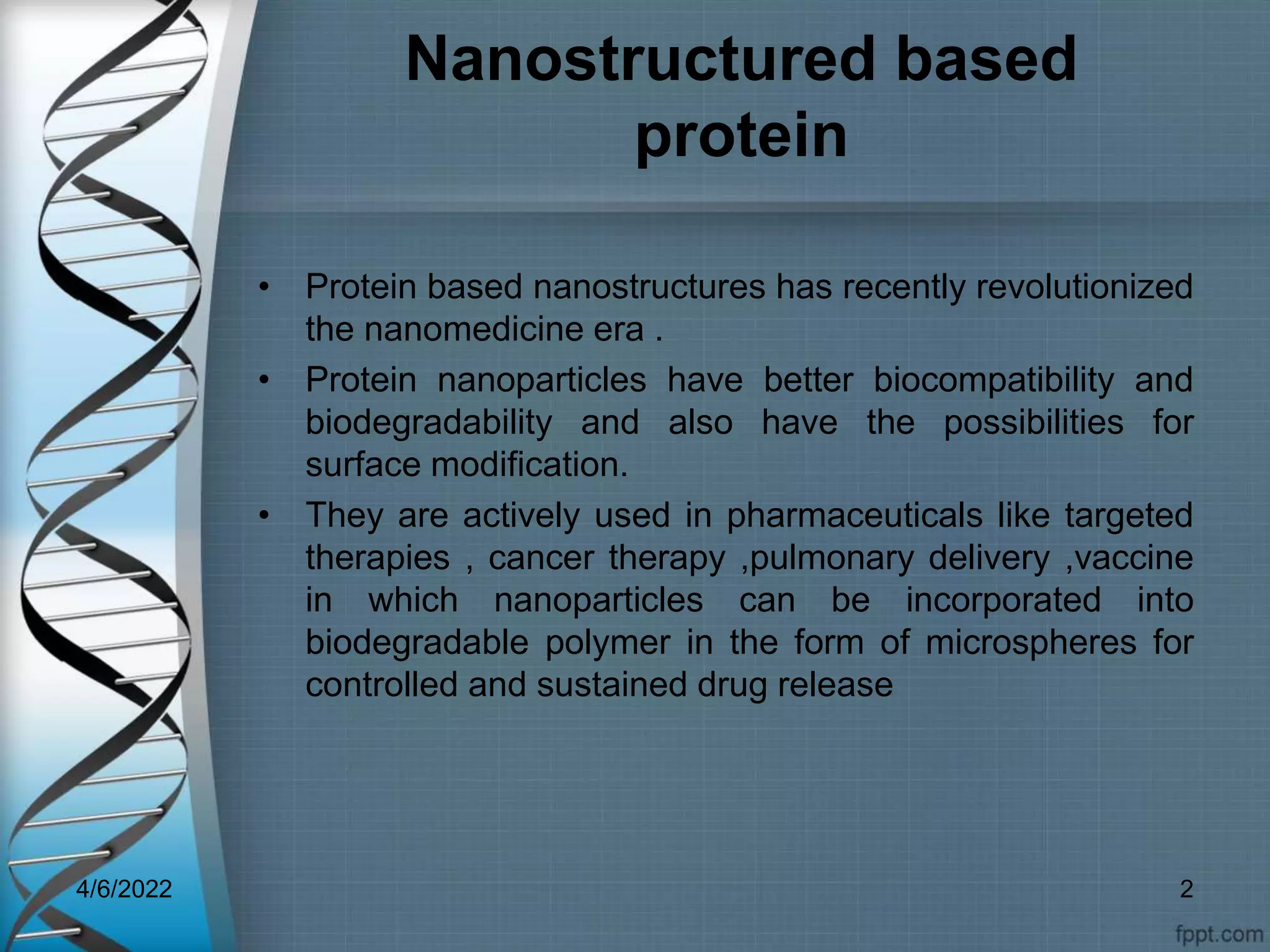 Protein-based nanostructures have revolutionized nanomedicine, offering enhanced biocompatibility and targeted drug delivery options, particularly in pharmaceuticals for various therapies. Different protein nanoparticles such as albumin, gelatin, and zein exhibit unique properties and advantages, including improved bioavailability and reduced toxicity. Their applications span drug delivery, immunological adjuvants, and treatment of diseases like cancer and tuberculosis.