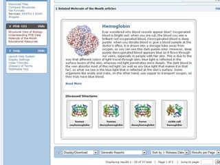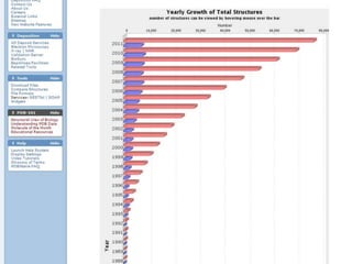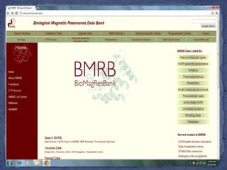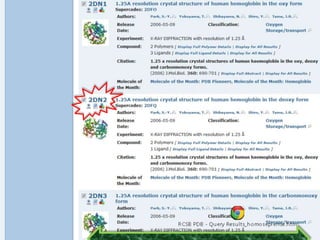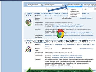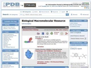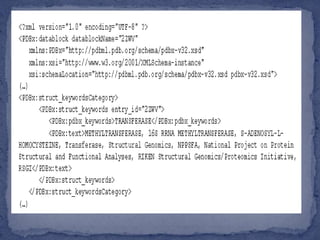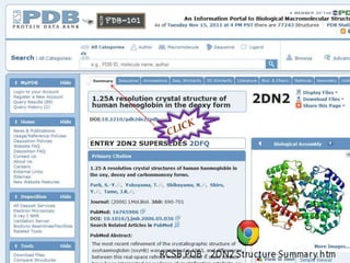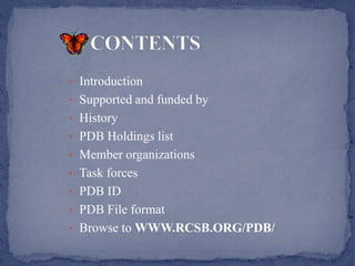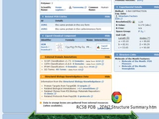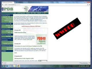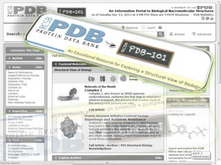 The Protein Data Bank (PDB) is the single worldwide database that stores the 3D structural data of large biological molecules such as proteins and nucleic acids. It contains data submitted by researchers from around the world. The PDB is operated by three member organizations and uses standardized file formats like PDB, mmCIF, and PDBML to store and represent structural data. Secondary databases categorize the PDB data in different ways, such as by structure, function, or evolutionary relationships. Visualization programs can be used to view PDB file contents. PDBWiki allows collaborative discussion and annotation of PDB structures, complementing the PDB's role as a primary data archive.