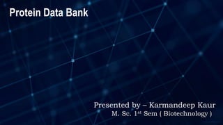 The Protein Data Bank (PDB) is an online archive of experimentally determined 3D structures of biological macromolecules, primarily proteins and nucleic acids, accessible to researchers and the public. Established in 1971 and now managed by the Research Collaboratory for Structural Bioinformatics, PDB utilizes various structure determination techniques and formats for data exchange. Its applications span drug discovery, structural genomics, and education, making it an essential resource in structural biology.