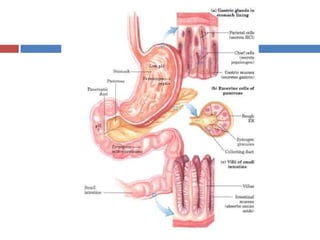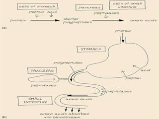 Protein digestion is a two-step process involving enzymes in the stomach and small intestine. In the stomach, pepsin breaks down proteins into smaller polypeptides and some amino acids. In the small intestine, proteases like trypsin and peptidases further break down polypeptides into dipeptides and individual amino acids, which are then absorbed. Tests like Biuret can detect the presence of proteins and the completeness of digestion. Factors like pH, temperature, and inhibitors affect the efficiency of protein digestion.