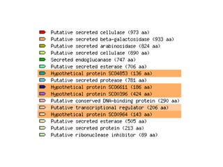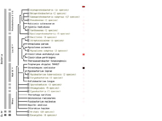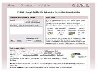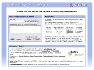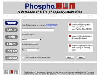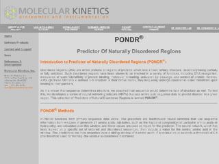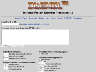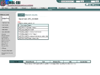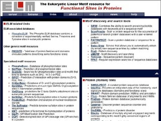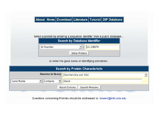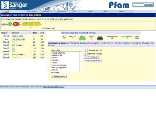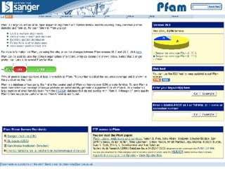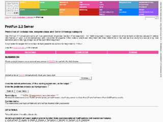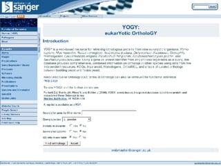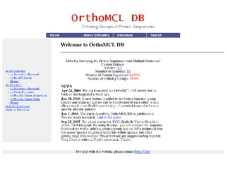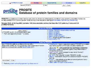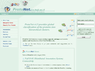 The document discusses various methods for predicting protein function, including homology-based transfer of annotation and prediction of functional motifs and domains. Homology-based transfer can infer molecular function from sequence similarity, but biological process is only transferable between orthologs. Orthologs can be detected through phylogenetic trees or automated methods like InParanoid. Each protein domain contributes to molecular function, while short motifs like phosphorylation sites are also important. Functional annotation involves describing proteins at the molecular, biological process, and cellular component levels.