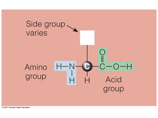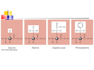 Proteins are composed of amino acids linked together by peptide bonds. There are 20 standard amino acids, of which 9 are essential and must be obtained through diet. Amino acids combine to form polypeptides and proteins, which take on unique 3D structures that determine their specific functions. Protein digestion breaks down proteins into amino acids so they can be absorbed and used for various purposes throughout the body.