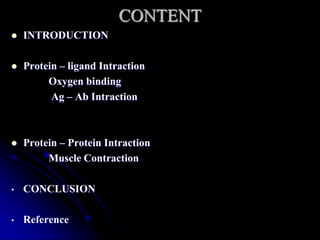 The document discusses protein-ligand and protein-protein interactions, highlighting their essential roles in biological functions and molecular processes like DNA replication. It explains oxygen binding in hemoglobin and myoglobin, detailing their structural characteristics and cooperative binding mechanisms. Additionally, it covers the structure of immunoglobulin G in antigen interaction and the mechanics of muscle contraction involving actin and myosin.