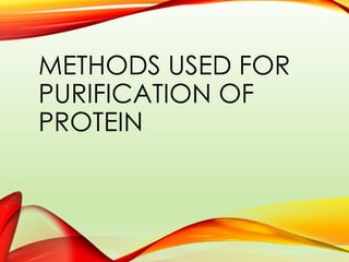 Protein purification involves isolating a protein of interest from a complex mixture using a series of separation steps. These steps exploit differences in protein size, properties, binding affinity, and activity. Common purification methods include extraction, precipitation, ultracentrifugation, and various types of chromatography. Size exclusion chromatography separates proteins based on size, while ion exchange and affinity chromatography separate proteins based on charge or specific binding interactions. The goal is to produce a purified protein sample suitable for downstream characterization, analysis, or use.