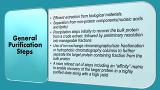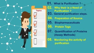 Protein purification is a series of processes to isolate a protein from a complex mixture. It is important to characterize a protein's function, structure, and interactions. The general steps of purification include preparing the source, exploiting differences in protein properties through separation techniques, and monitoring purity with assays. Purification yields a pure protein sample for determining its sequence, structure, and role. Affinity tags and other tags are often used to aid purification. Biopharmaceuticals are medically important proteins produced through biotechnology.