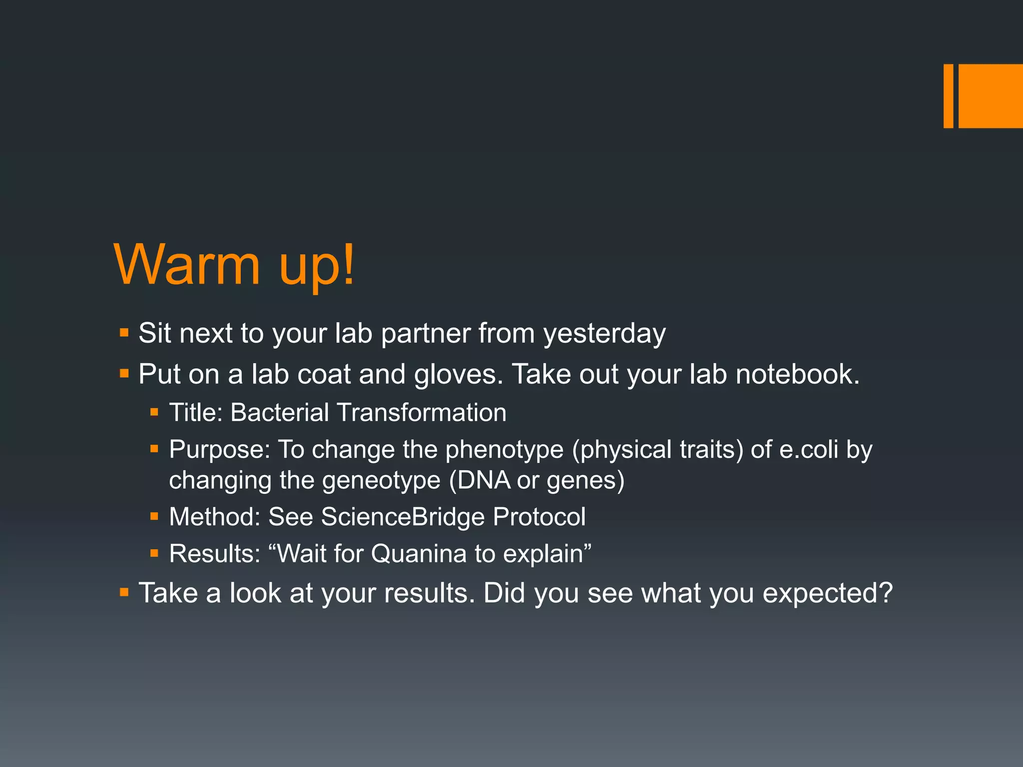 The document provides instructions for purifying fluorescent proteins expressed in E. coli, including breaking open the cells, separating cell debris via centrifugation, and using nickel beads and column chromatography to isolate the fluorescent proteins from other proteins in the supernatant. Key steps involve lysing the cells with lysozyme, binding the fluorescent proteins to nickel beads via their histidine tags, and eluting the purified proteins from the column using imidazole buffer.