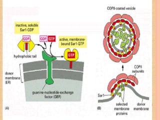 The document discusses protein targeting and sorting, which is essential for the proper distribution of newly synthesized proteins within cells, with processes varying between prokaryotes and eukaryotes. Key points include the role of signal sequences in directing proteins to their destinations, protein translocation mechanisms through membranes, and the functions of the endoplasmic reticulum and Golgi apparatus in processing and transporting proteins. It also highlights the energy requirements for these transport processes and references significant contributions in the field, including those leading to Nobel Prize recognition.