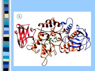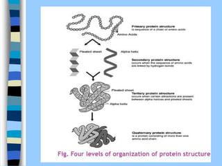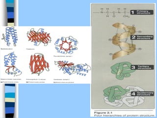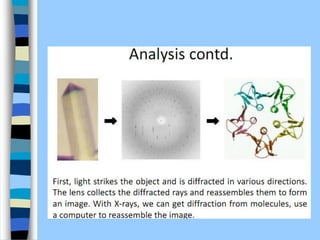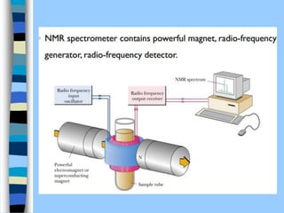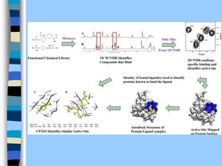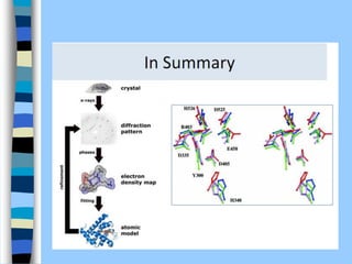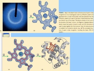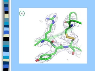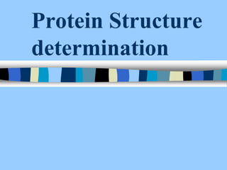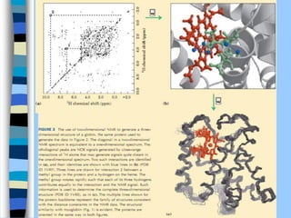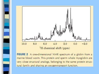 There are two main approaches to determining protein structure - physical methods like NMR and X-ray crystallography, and computational methods like comparative modeling. NMR spectroscopy is a powerful tool that can be used to determine protein structures in solution. It works by applying a strong magnetic field to align nuclear spins, then applying radio waves to induce transitions between spin states. This provides information about interatomic distances that can be used to build 3D protein structures. COSY data identifies which peaks correspond to which amino acids, while NOESY data provides spatial information about nearby atoms. Together this data is used to determine protein conformations and dynamics in vivo.