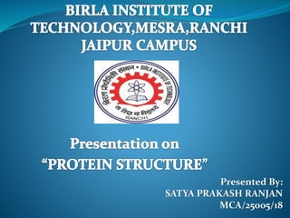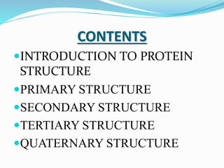 This document discusses the different levels of protein structure: primary, secondary, tertiary, and quaternary. The primary structure refers to the amino acid sequence. Secondary structure involves local folding into alpha helices or beta sheets. Tertiary structure describes the overall 3D shape of a single polypeptide chain. Quaternary structure refers to the arrangement of multiple polypeptide subunits in a multimeric protein. Recent discoveries are mentioned about determining the structures of specific proteins and learning more about their functions.