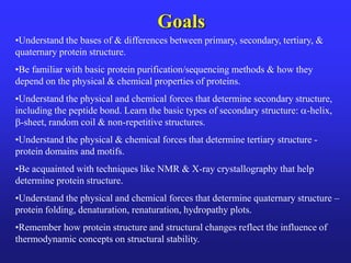 This document outlines the goals and key concepts regarding protein structure. It discusses the four levels of protein structure - primary, secondary, tertiary, and quaternary. Methods for determining protein structure are also covered, including protein purification techniques like chromatography, electrophoresis, and centrifugation. Protein sequencing methods such as Edman degradation are also summarized. The document provides an overview of protein structure and analysis.