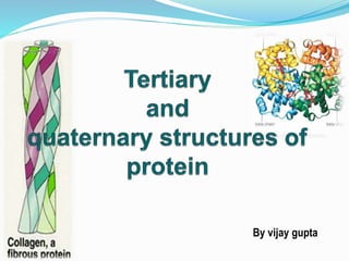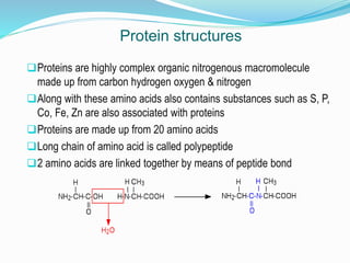 The document discusses the complex structures of proteins, which are organic macromolecules made up of amino acids and other elements. It classifies protein structures into primary, secondary, tertiary, and quaternary, detailing the characteristics and bonding of each level, such as alpha helices and beta pleated sheets. The document also differentiates between fibrous and globular proteins, explaining their structural roles and functions.