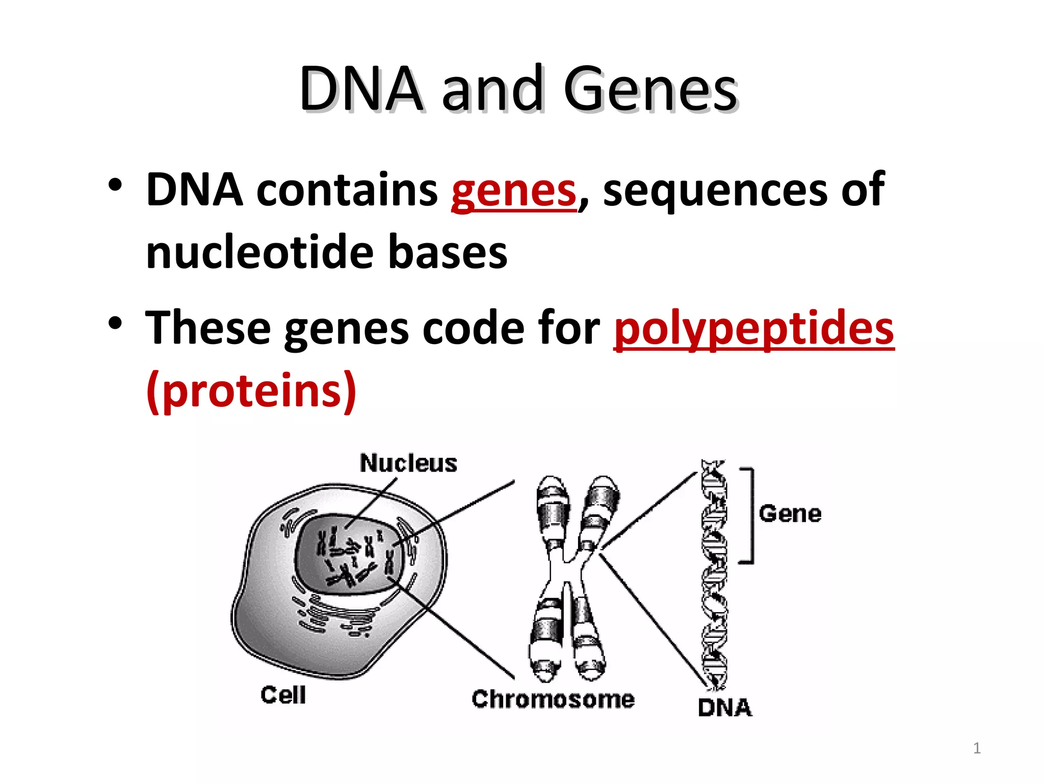 The document discusses DNA, genes, and the process of protein synthesis. It explains that DNA contains genes which code for proteins. There is a two-step process for protein synthesis: transcription copies DNA into mRNA in the nucleus, and translation uses mRNA and tRNA to assemble amino acids into proteins at the ribosome. The ribosome binds mRNA and tRNA to join amino acids together into polypeptide chains based on the genetic code, resulting in the production of proteins.
