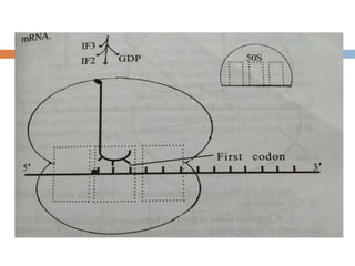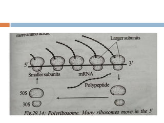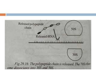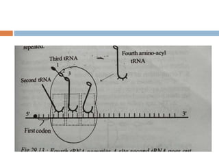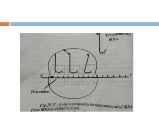Protein synthesis is the process of constructing protein molecules from amino acids through transcription and translation, occurring primarily in the cytoplasm. The central dogma involves the transcription of DNA to mRNA, followed by the translation of mRNA into a polypeptide chain, requiring various cellular components including ribosomes and tRNA. The process also includes post-translational modifications to activate the polypeptide chain after synthesis.