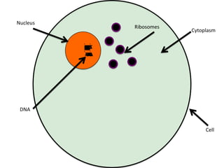The document describes the process of transcription and translation in a cell. RNA polymerase unwinds DNA and creates an mRNA strand in the nucleus. The mRNA strand then moves to the cytoplasm through the nuclear pore. In the cytoplasm, the mRNA strand binds to a ribosome where tRNA brings amino acids to add to a growing polypeptide chain based on the mRNA codons. The polypeptide chain then folds into the final 3D protein structure.