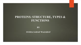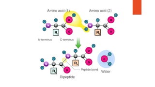 Proteins are made up of chains of amino acids that fold into complex 3D shapes defined by their sequence. There are 20 types of amino acids that can be combined to form the primary structure of a protein. The sequence determines the unique secondary, tertiary, and sometimes quaternary structures which define a protein's specific function. Proteins perform most of the work in cells and have roles in structure, function, regulation and catalysis. The seven main types of proteins include enzymes, structural proteins, transport proteins and more, each with distinct functions in the body.