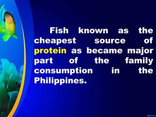 Fish proteins are an important source of nutrition in the Philippines. Proteins are composed of amino acids, with 20 standard amino acids serving as the building blocks. When cells make proteins, amino acid groups are linked together to form polypeptide chains of varying lengths. A protein's structure can be primary, secondary, tertiary, or quaternary depending on interactions between amino acid chains. Proteins are classified by their composition as simple proteins like albumins and globulins, or conjugated proteins which contain additional groups. They are also classified by function, with examples being structural, contractile, enzymatic, hormonal, and blood proteins. Protein breakdown through autolysis leads to changes in fish flesh quality over time.