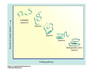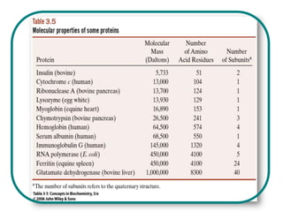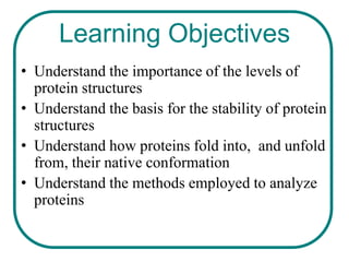 The document discusses the structure of proteins at multiple levels: primary, secondary, tertiary, and quaternary. The primary structure is the amino acid sequence. Secondary structures include alpha helices and beta sheets formed by hydrogen bonds. Tertiary structure involves the folding of secondary structures into compact 3D shapes stabilized by interactions like hydrophobic effects. Quaternary structure refers to the arrangement of multiple polypeptide subunits in a single protein. The document also covers protein classification, folding, isolation, and sequencing techniques.