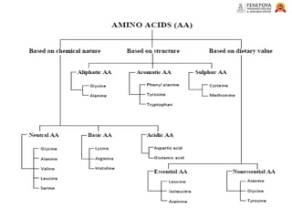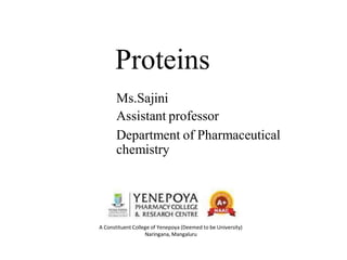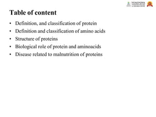 This presentation provides a comprehensive overview of proteins, covering their definition, classification, and structures, along with the classification of amino acids. It explains the biological roles of proteins and amino acids and highlights key diseases related to protein malnutrition such as Kwashiorkor, Marasmus, and Nutritional Edema. Ideal for pharmacy and life science students.