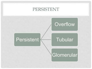 The document discusses proteinuria, or excess protein in the urine. It defines normal protein excretion and levels of proteinuria like microalbuminuria and nephrotic range proteinuria. There are three main mechanisms of proteinuria - glomerular, tubular, or overflow. Glomerular issues allow albumin and immunoglobulins into the urine while tubular diseases prevent reabsorption of low molecular weight proteins. The document also covers evaluating proteinuria using urine dipsticks, microscopic analysis of urine sediments, and considering causes of proteinuria.