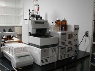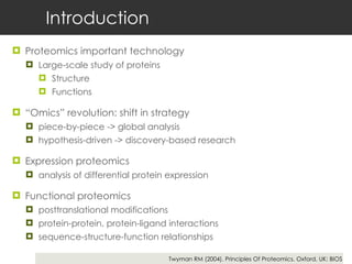 Proteomics is the large-scale study of proteins, including their structures, functions, and interactions. It has become an important technology for understanding biological systems on a global scale. Mass spectrometry plays a key role in proteomic analysis by allowing researchers to identify and characterize proteins and their post-translational modifications like phosphorylation. There are challenges in analyzing post-translational modifications since proteins exist in multiple modified forms, but methods like affinity enrichment and tandem mass spectrometry are used to map modifications and locate them on protein sequences.