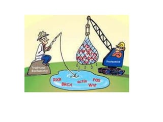 Proteomics is the study of the structure and function of proteins. It involves identifying and quantifying the proteins expressed by a genome or cell type. Key aspects of proteomics include protein separation techniques like gel electrophoresis, mass spectrometry to identify proteins, and analyzing protein interactions and post-translational modifications. While genomes provide the blueprint, proteomics helps understand the diversity of proteins expressed and how they function together to direct cellular activities. It is a promising tool for disease diagnosis by identifying protein biomarkers.