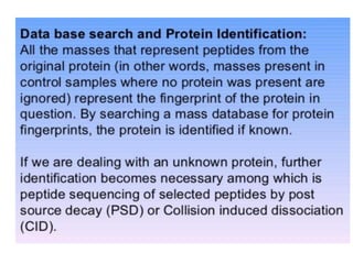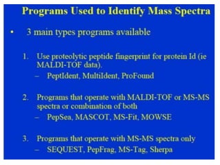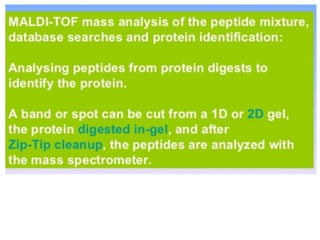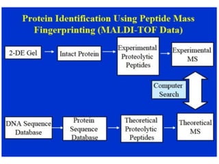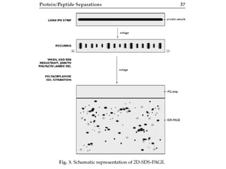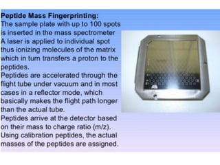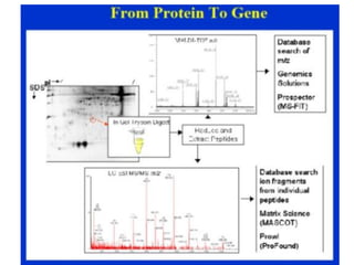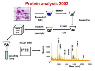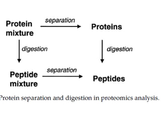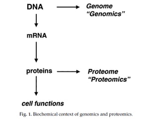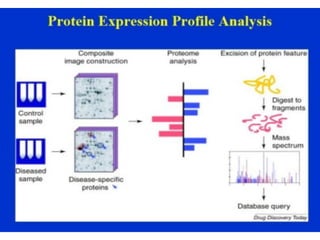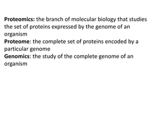 Proteomics is the study of the entire set of proteins produced by a cell type, examining how proteins interact with cellular processes and the environment. It aims to highlight differences in proteomes under various conditions, with applications in cancer research for early detection and individualized treatment plans. Key techniques in proteomics include mass spectrometry, x-ray crystallography, nuclear magnetic resonance, and protein microarrays to analyze protein structure and functionality.