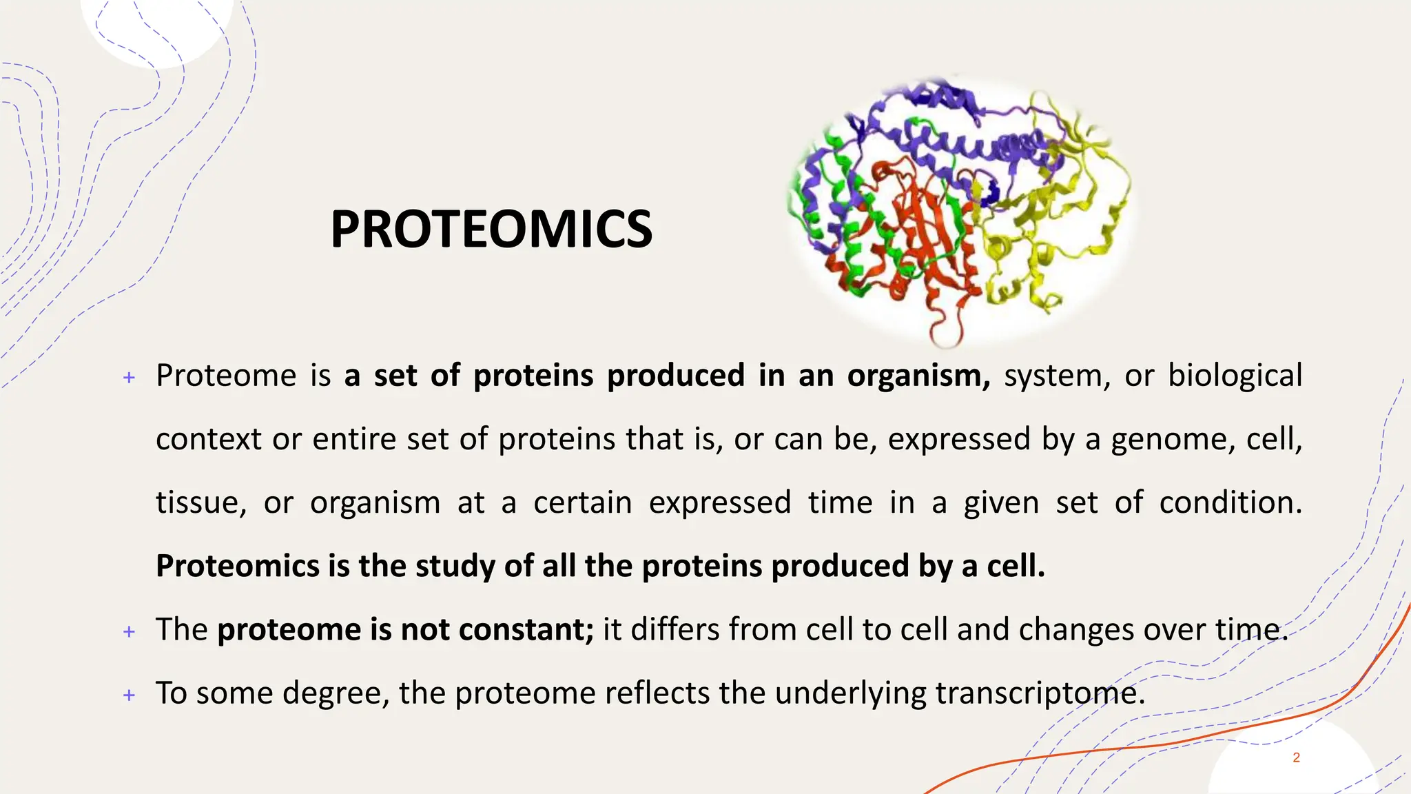 Proteomics is the comprehensive study of proteomes, which are the entire set of proteins expressed by an organism under specific conditions, and can vary between different cell types and stages. This field includes various types of proteomic analyses such as structural, functional, and expression proteomics, each focusing on different aspects of protein characteristics and dynamics. Techniques like mass spectrometry and protein profiling are essential for identifying, quantifying, and understanding protein interactions and modifications, playing a crucial role in advancing biomedical research, including cancer studies.