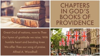 Presentation examining sovereignty of God in the British Isles, developing a Protestant Monarchy for the preservation of Gospel liberties and the guaranteeing of that most precious commodity - freedom. For accompanying audio and video tinysa.com/sermon/68222140251659