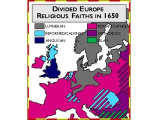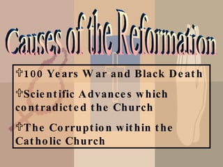 The Protestant Reformation was a 16th century movement aimed at reforming corruption within the Catholic Church. Martin Luther posted his 95 Theses criticizing indulgences and papal authority in 1517, which helped spark the Reformation. This led to the formation of Protestant religions separate from Catholicism and a split in Christianity. The Reformation spread ideas like "faith alone" and challenged the Church's authority, while the Counter-Reformation strengthened Catholic doctrines and launched the Inquisition in response.