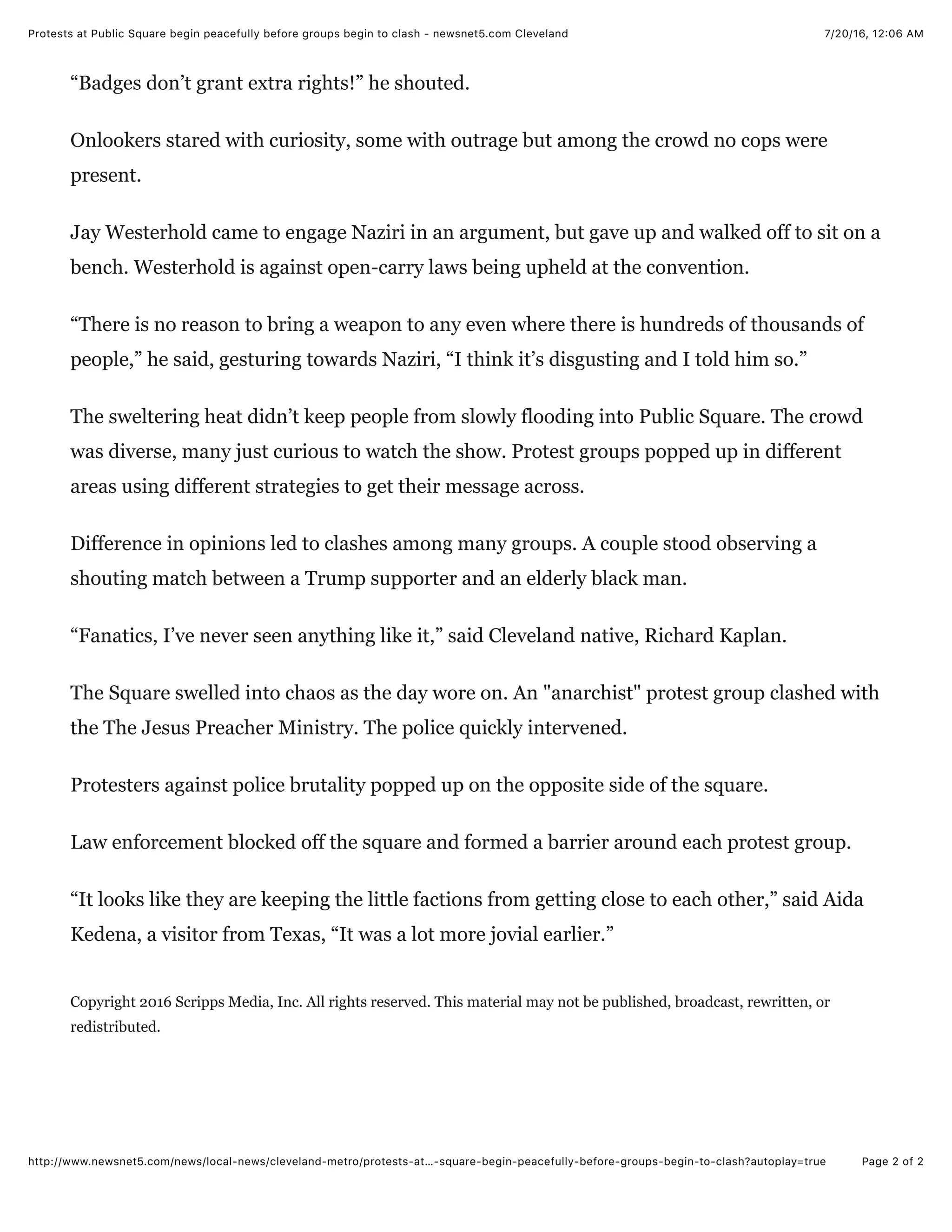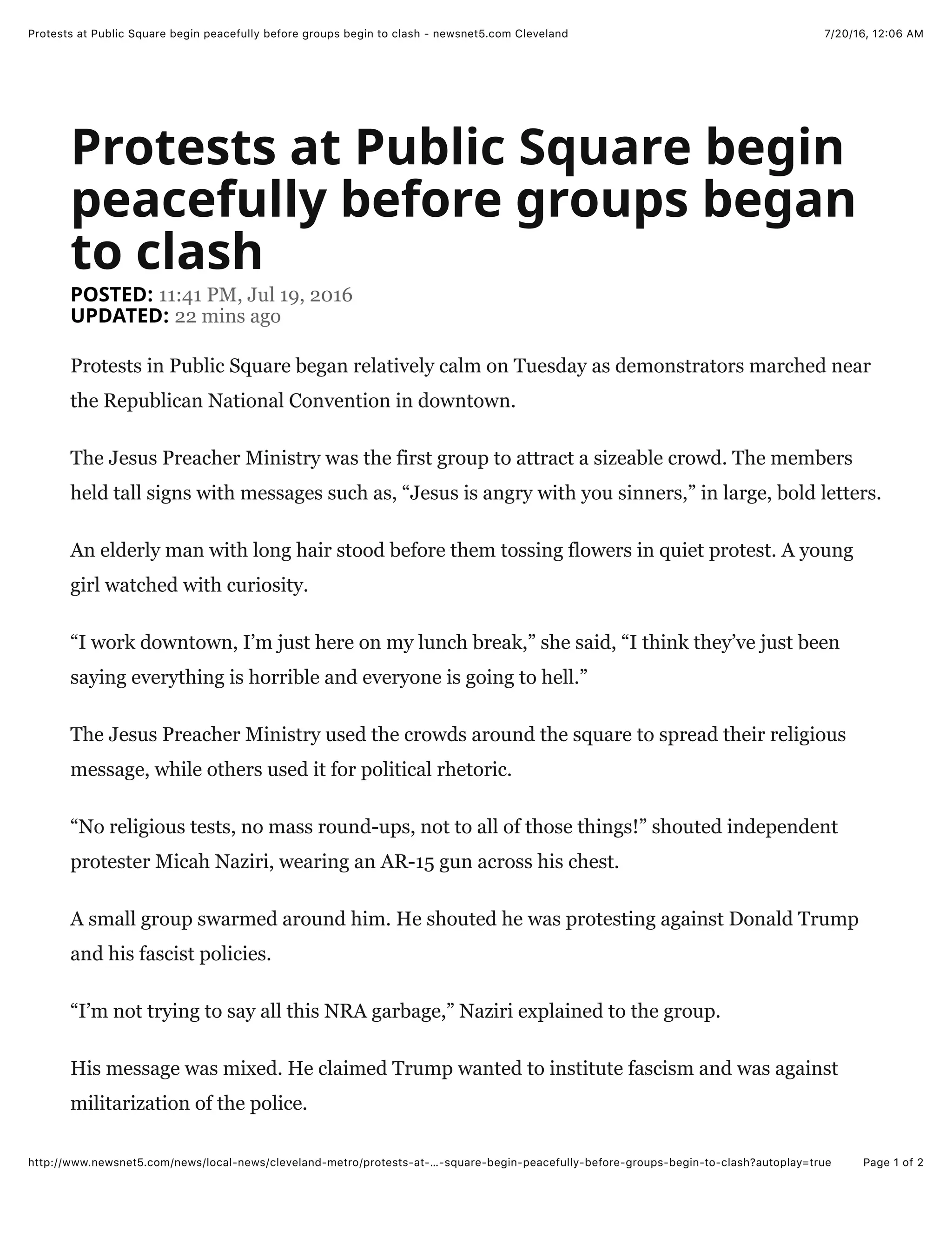 Protests began peacefully in Public Square in Cleveland but grew chaotic as the day wore on. Various groups with differing political and religious messages gathered, including supporters of Donald Trump, protesters against police brutality, and a ministry preaching about sin. Tensions rose as protesters clashed, with arguments breaking out between Trump supporters and others. The police eventually blocked off the square and separated clashing protest groups to prevent further conflicts.