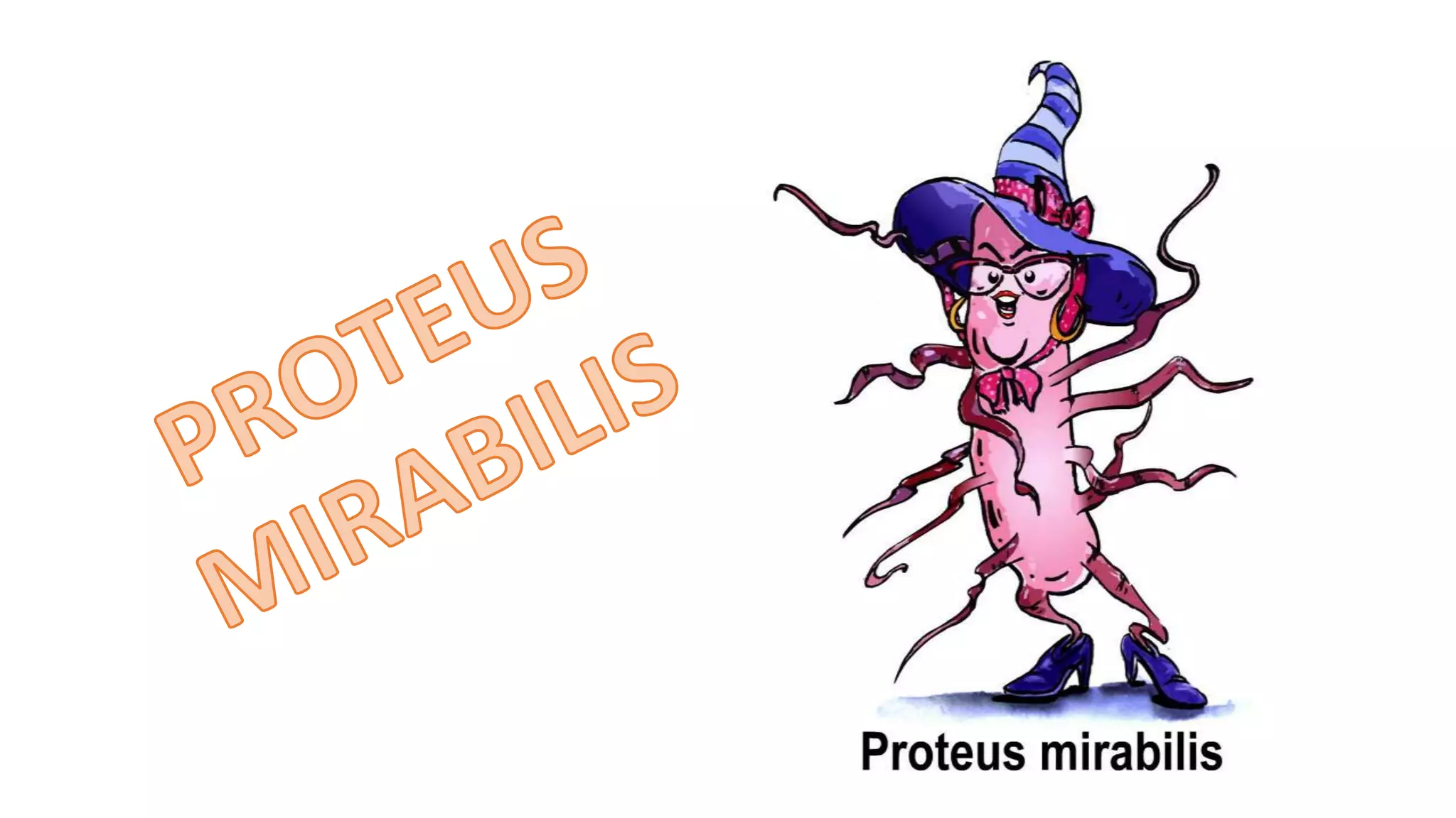 Proteus is a gram-negative bacteria commonly found in the gut that can cause urinary tract infections. It is motile due to flagella and has a fishy odor. P. mirabilis and P. vulgaris are medically important species, with P. mirabilis causing most UTIs through production of urease which hydrolyzes urea to ammonia, raising urine pH. Symptoms include urethritis, cystitis and pyelonephritis. It is identified in culture through swarming motility and biochemical tests. Virulence factors include urease, hemolytic toxins, and motility. Treatment involves antibiotics like beta-lactams, aminoglycosides and fluor