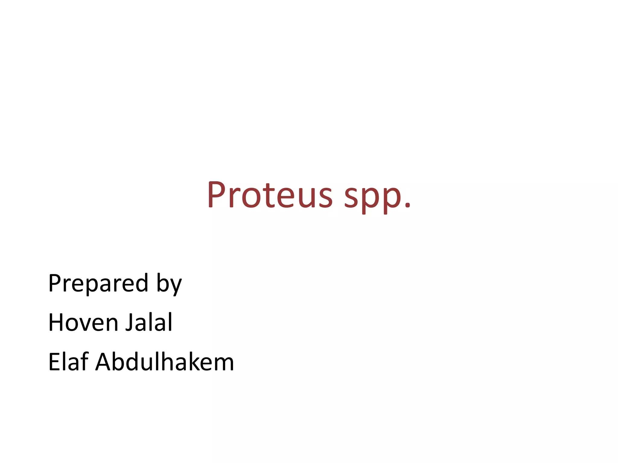 Proteus spp. are gram-negative, facultatively anaerobic, motile bacilli commonly found in the human intestinal tract. The two main species of medical importance are P. mirabilis and P. vulgaris. They can cause various infections opportunistically. Diagnostic tests include gram stain showing gram-negative rods, growth on blood agar showing swarming motility, and positive reactions in the TSI test and oxidase test. Identification of species involves examining reactions in IMViC tests and analyzing biochemical profiles using systems like API or Vitek.