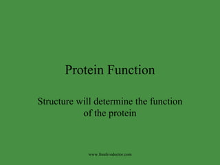 The structure of a protein determines its function. For enzymes, the binding site or active site allows substrates to bind via lock-and-key or induced fit mechanisms. Myoglobin and hemoglobin both contain heme groups to bind oxygen, but differ in structure - myoglobin is spherical while hemoglobin is a tetramer. This allows hemoglobin to exhibit cooperative binding and transport oxygen more efficiently than myoglobin via conformational changes.
