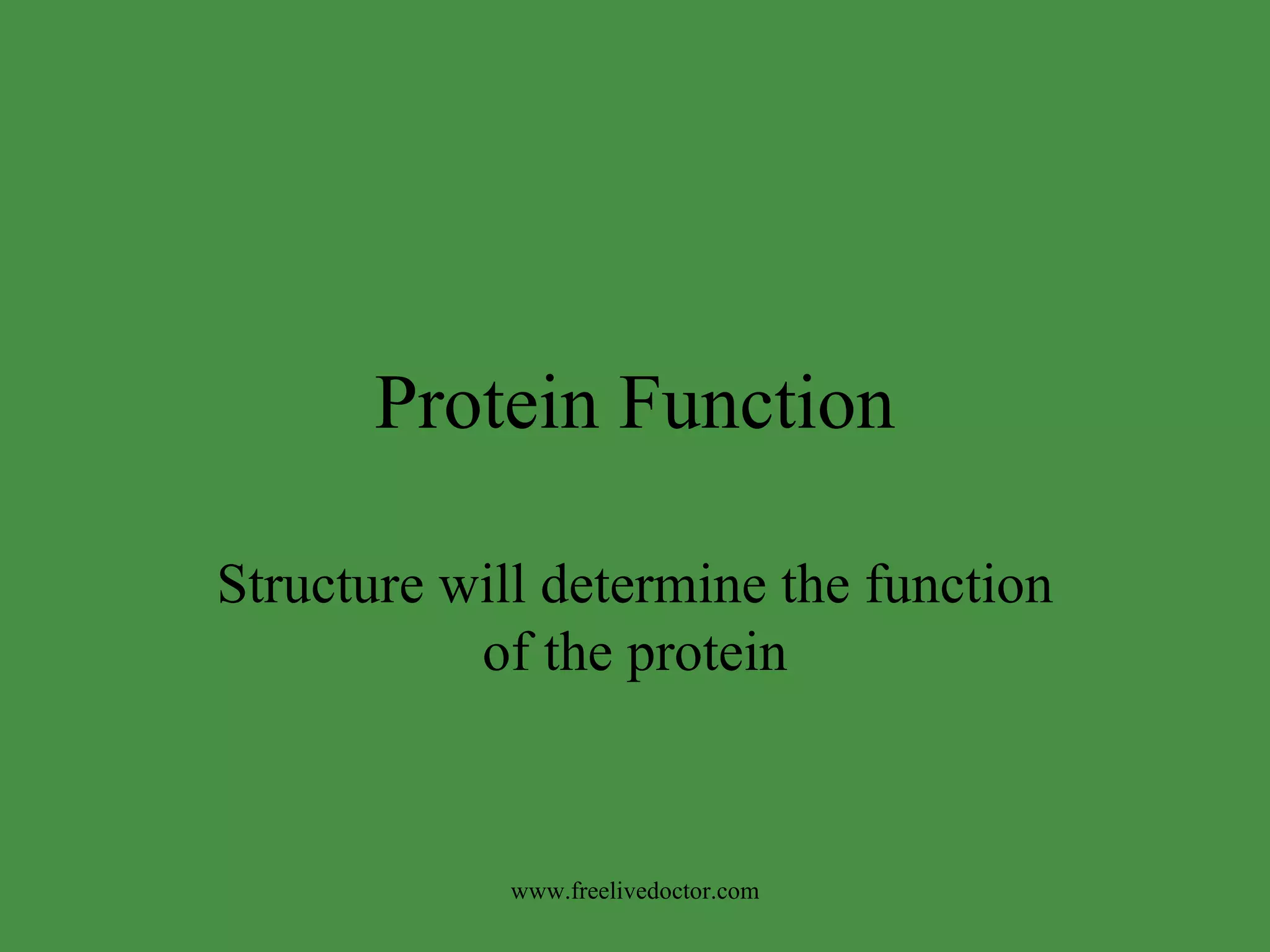 The structure of a protein determines its function. For enzymes, the binding site or active site allows substrates to bind via lock-and-key or induced fit mechanisms. Myoglobin and hemoglobin both contain heme groups to bind oxygen, but differ in structure - myoglobin is spherical while hemoglobin is a tetramer. This allows hemoglobin to exhibit cooperative binding and transport oxygen more efficiently than myoglobin via conformational changes.