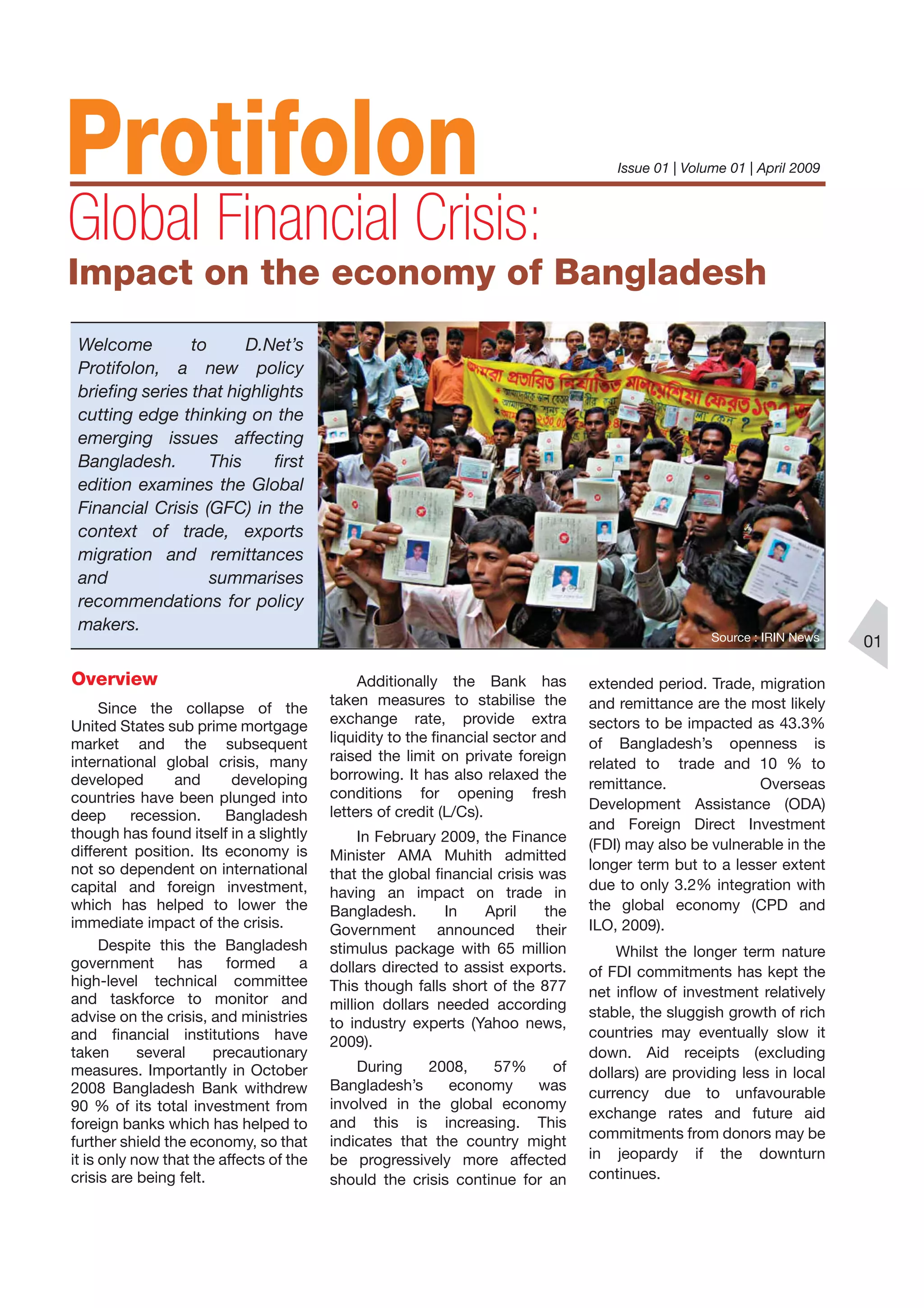 The first edition of d.net's Protifolon series addresses the global financial crisis and its impact on Bangladesh, focusing on trade, exports, migration, and remittances, while offering policy recommendations. Despite being less dependent on international integration, Bangladesh's economy is still affected, particularly in the ready-made garments (RMG) sector. The document highlights the crucial role of remittances and calls for strategies to protect migrant workers and stimulate job creation in response to the ongoing challenges.