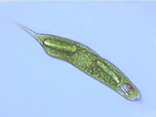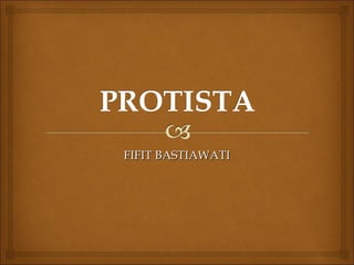 Dokumen tersebut membahas tentang Protista sebagai organisme eukariot pertama yang berevolusi dari prokariot. Protista memiliki ciri-ciri seperti uniseluler atau multiseluler, memiliki organel sel yang lebih kompleks dari prokariot, serta hidup bebas atau bersimbiosis. Dokumen ini juga menjelaskan struktur dan fungsi dari berbagai jenis Protista seperti Rhizopoda, Flagellata, Ciliata, Sporozoa, serta Algae.