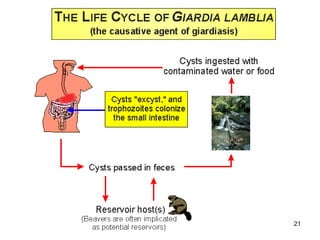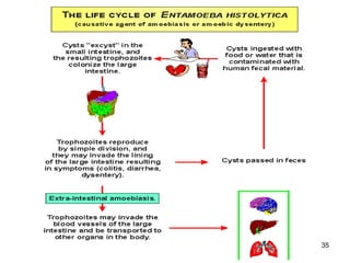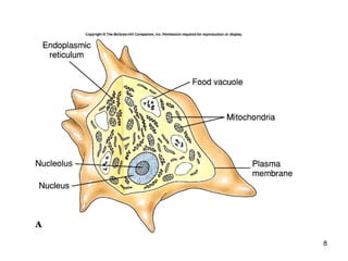 The document discusses different kingdoms and phyla of protozoa. It describes their characteristics such as being single-celled, motile, and reproducing both sexually and asexually. Some protozoa are autotrophs that make their own food, while others are heterotrophs that absorb food. The document also summarizes several important diseases caused by protozoan parasites, including malaria, African sleeping sickness, toxoplasmosis, and amoebic dysentery.