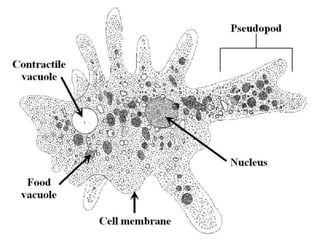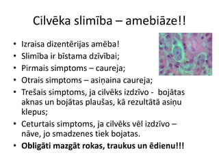 AmēbasCilvēka slimība –amebiāze!!Izraisa dizentērijas amēba!Slimība ir bīstama dzīvībai;Pirmais simptoms – caureja;Otrais simptoms – asiņaina caureja;Trešais simptoms, ja cilvēks izdzīvo - bojātas aknas un bojātas plaušas, kā rezultātā asiņu klepus;Ceturtais simptoms, ja cilvēks vēl izdzīvo – nāve, jo smadzenes tiek bojatas.Obligāti mazgāt rokas, traukus un ēdienu!!!