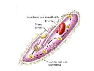 Cilvēka slimība -MalārijaIzplatīta silto zemju zemēs – jo aukstajos reģionos plazmodiji iet bojā;Simptomi:Augsta ķermeņa temperatūra;Svīšana;Galvassāpes;Drudža lēkmes.Drudža lēkmes sākas tad, kad plīst pārpildītie eritrocīti;