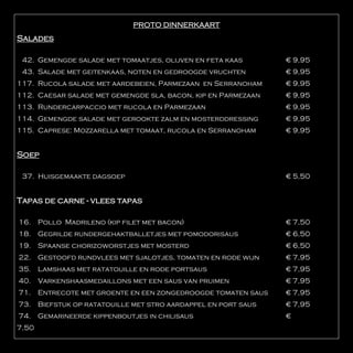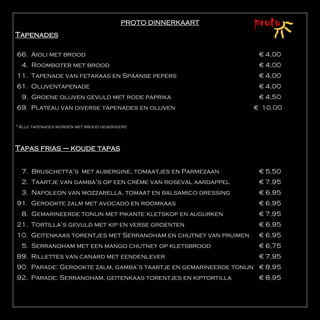 De tapaskaart van Proto biedt veel variatie en omvat verschillende tapenades, koude tapas, groentetapas, salades, vleestapas en tapas met vis. Zin in iets speciaals? Dan kunt u kiezen voor één van de menusuggesties van onze kok.
