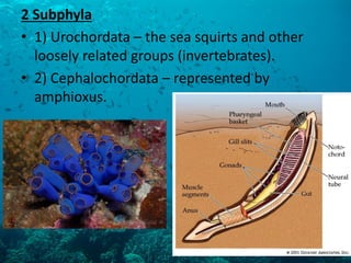 Protochordates have two subphyla: urochordates and cephalochordates. Urochordates include sea squirts and related invertebrate groups, while cephalochordates are represented by amphioxus. Amphioxus is considered the most basal chordate and shares several anatomical similarities with the larval stage of lampreys, including a dorsal nerve cord, brain, myomeres, and filter feeding behavior, though amphioxus lacks a heart and organized kidney.