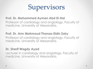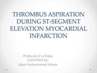 This document outlines a protocol for a thesis that will compare outcomes of percutaneous coronary intervention (PCI) with manual thrombus aspiration versus PCI alone for patients with ST-segment elevation myocardial infarction (STEMI). The study will enroll 80 patients who will be randomly assigned to receive either conventional PCI or PCI with thrombus aspiration. The primary endpoint is 30-day mortality. Secondary endpoints include complications of PCI, stroke, heart failure, length of hospital stay, and TIMI flow grade. All patients will undergo clinical assessments, cardiac biomarkers, echocardiography, and PCI. Post-procedure antiplatelet therapy will also be standardized.